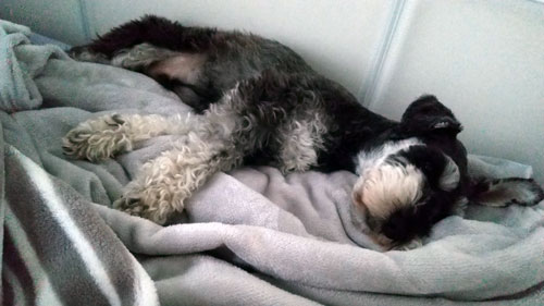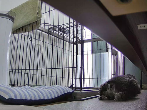 ↑お留守番中、変なところで寝ていた。ケージとベッドの隙間。